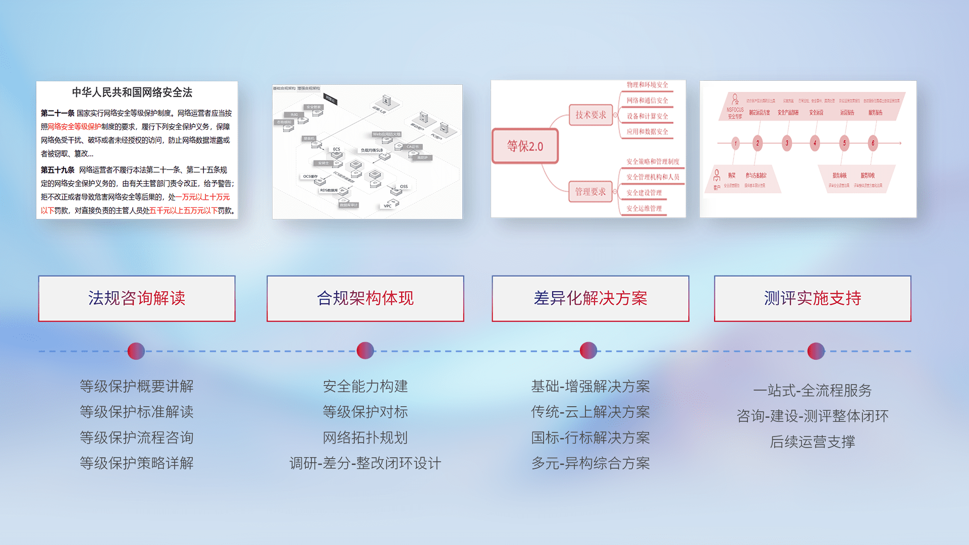 通过专业的法律咨询解读、、、合规架构体现、、差异化解决方案、、测试实施支持等服务,,,为客户量身打造等保合规体系。。